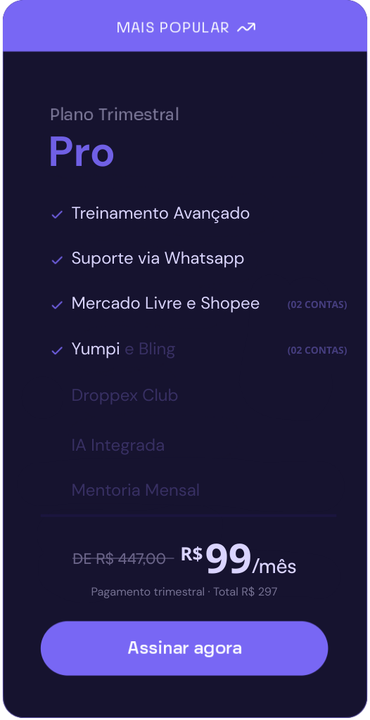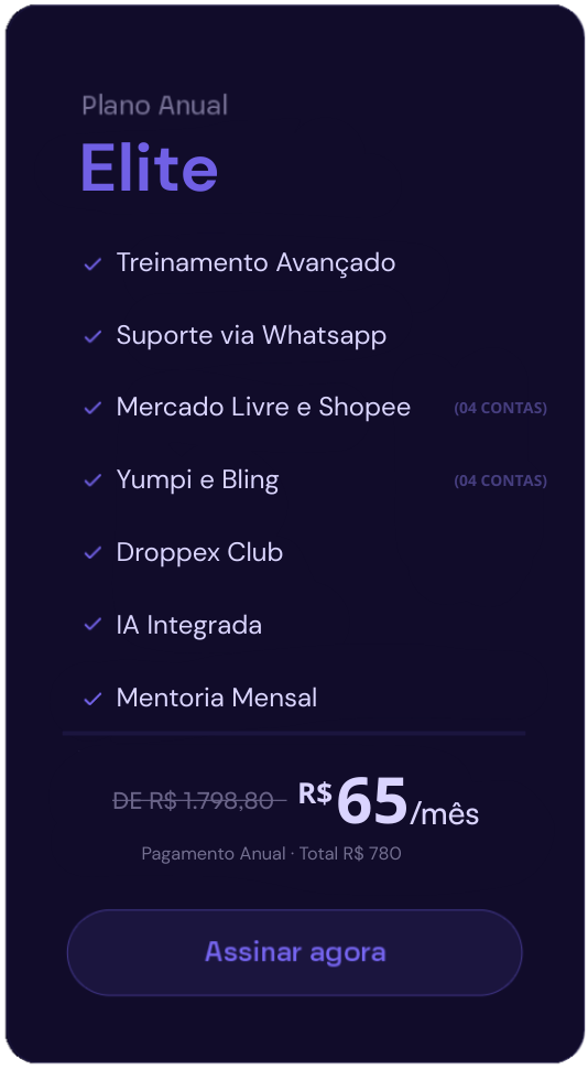 Não há cobranças escondidas. O que você paga além da assinatura são os custos normais do negócio: comissão dos marketplaces, frete (embutido no preço final), anúncios (opcional) e repasse do pedido ao fornecedor.