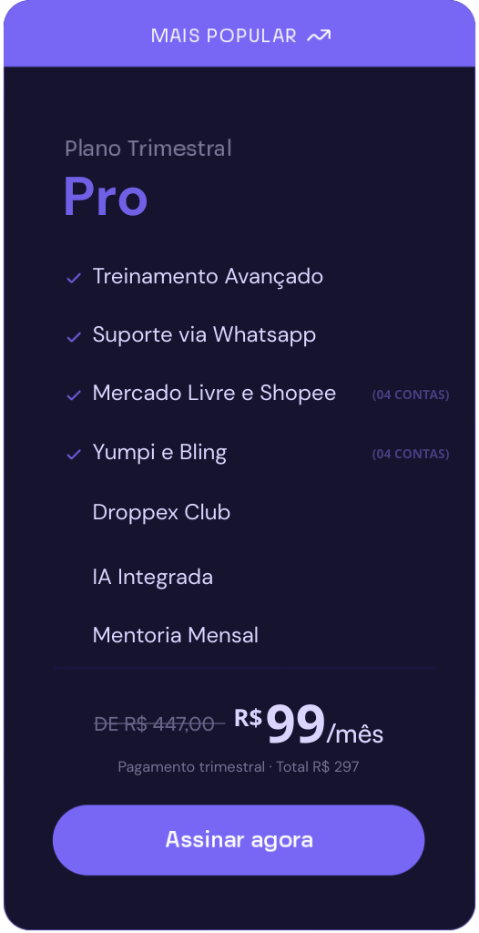Não há cobranças escondidas. O que você paga além da assinatura são os custos normais do negócio: comissão dos marketplaces, frete (embutido no preço final), anúncios (opcional) e repasse do pedido ao fornecedor.